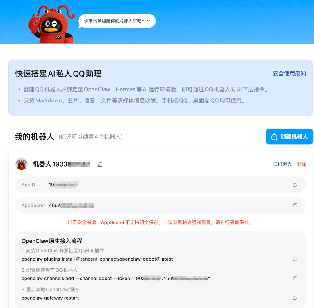 # 卸载旧插件(首次安装可跳过)openclaw plugins uninstall qqbotopenclaw plugins uninstall openclaw-qqbot# 安装最新版本openclaw plugins install @tencent-connect/openclaw-qqbot@latest# 配置通道(将 AppID 和 AppSecret 替换为你的实际值)openclaw channels add --channel qqbot --token "AppID:AppSecret"# 重启服务openclaw gateway restart