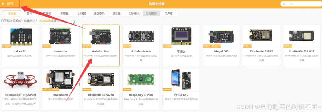 (3)单击“扩展”,弹出如下的窗口,选择“主控板”后,再单击“Arduino UNO”,最后点击左上角的“返回”。