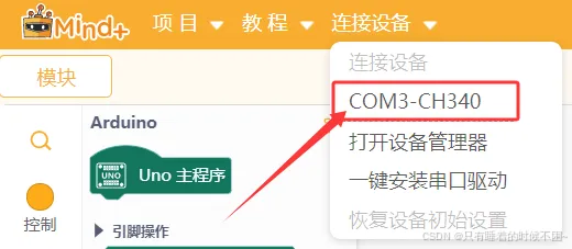 同时,工具栏的连接设备中已经选择了Arduino UNO 主板的设备型号COM3-CH340(注意:不同版本的Arduino UNO 主板,此处连接的设备型号也不同)。