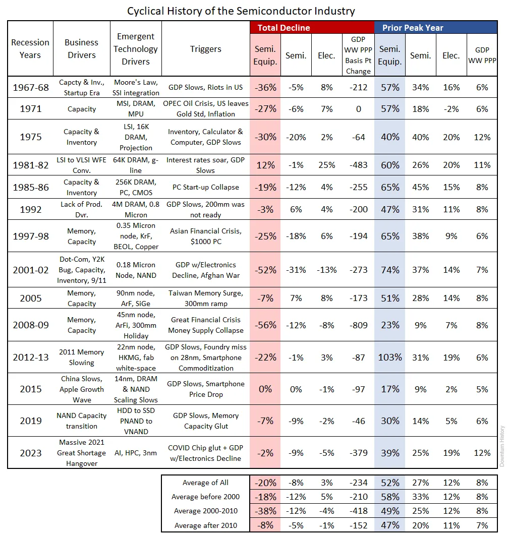 从历史上看,集成电路产业自1963年形成以来,已经出现过14次“衰退式增长”,平均约4.4年就会经历一轮明显调整;而且设备行业的波动通常比芯片本身更大。资料统计显示,历史平均降幅约为:半导体为8%,半导体设备约为20%。