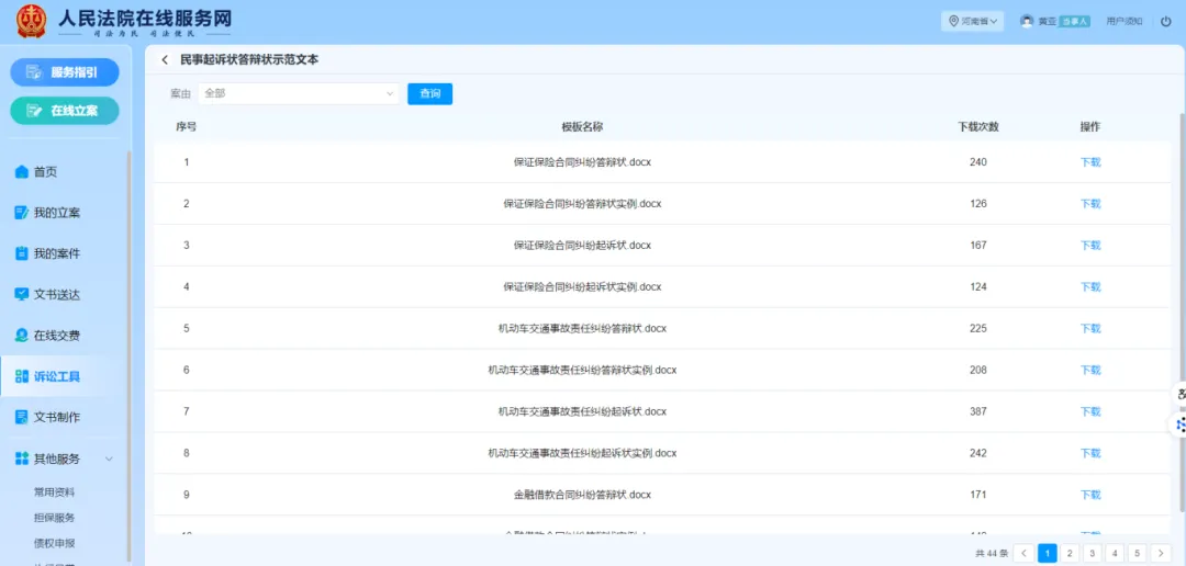 电脑检索“人民法院在线服务网”并登录→诉讼工具→部分案件民事起诉状、答辩状示范文本进行下载。