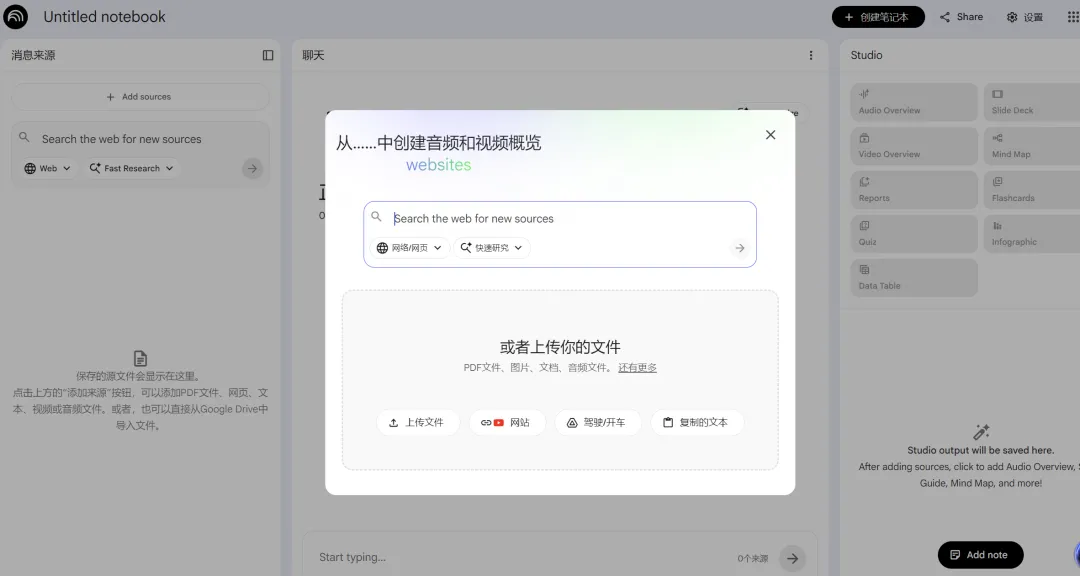 支持PDF、Google Docs、网页链接、YouTube视频、纯文本。