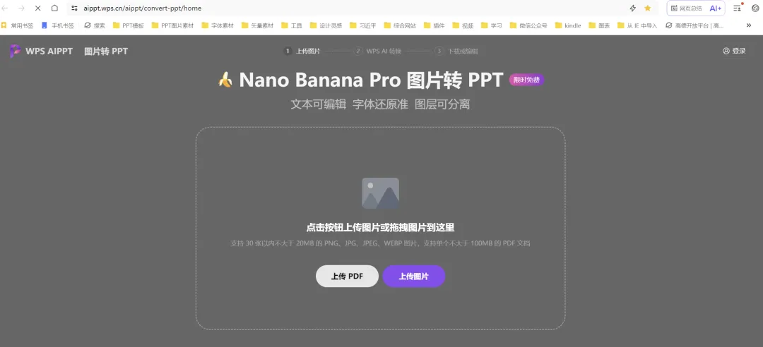 下载PDF,用WPS AIPPT网页版本上传,点击“PDF转化为PPT”。转换后可能会有错别字,用WPS审阅里的“校对”功能自动修改,再手动删掉水印。适合大范围修改,但复杂图形可能变形。