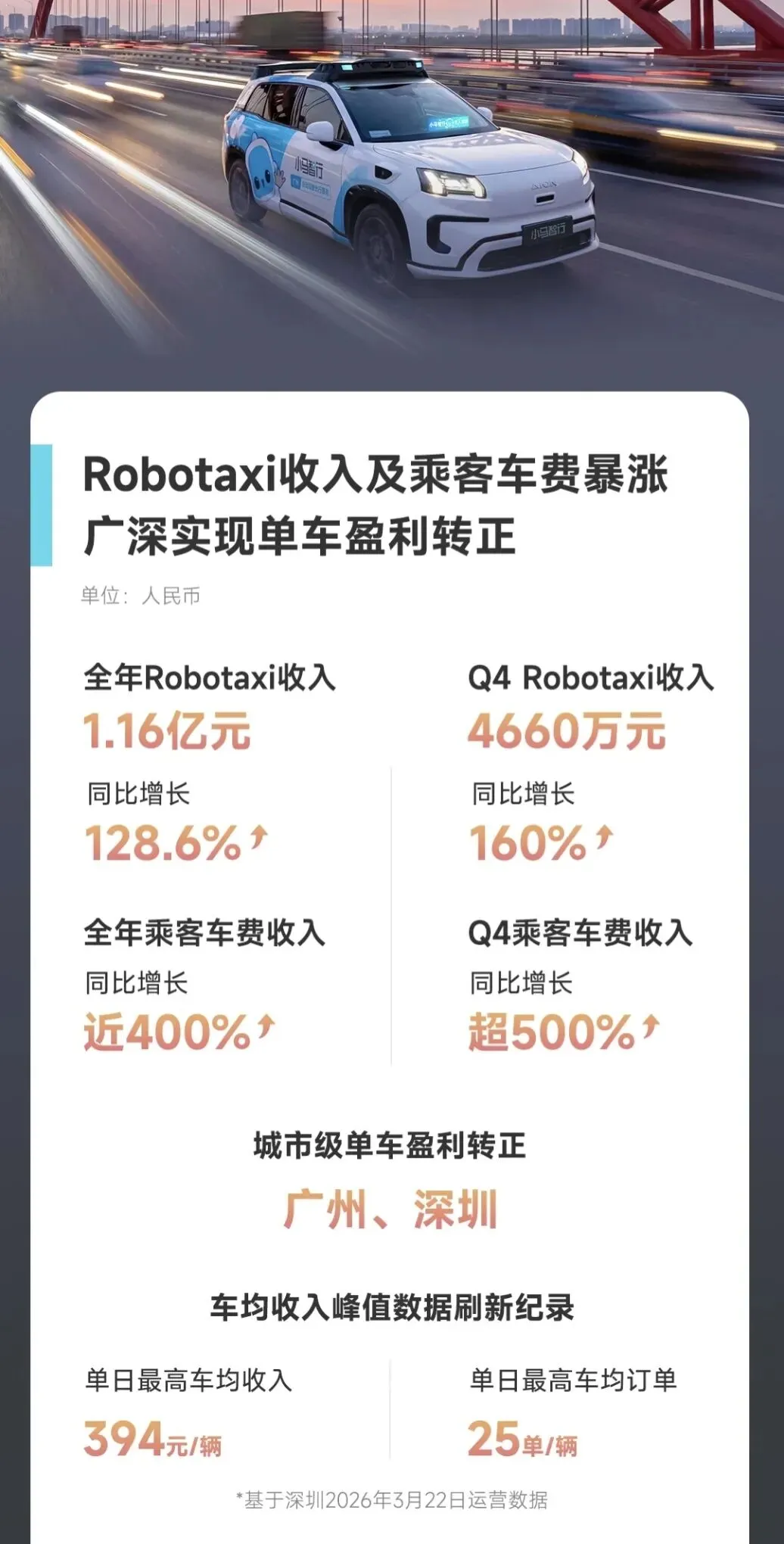 更重要的是,第七代Robotaxi在广州、深圳先后实现单车运营盈利(UE)转正。2026年3月,深圳地区单日车均净收入达到394元,车均订单25单,创下行业纪录。