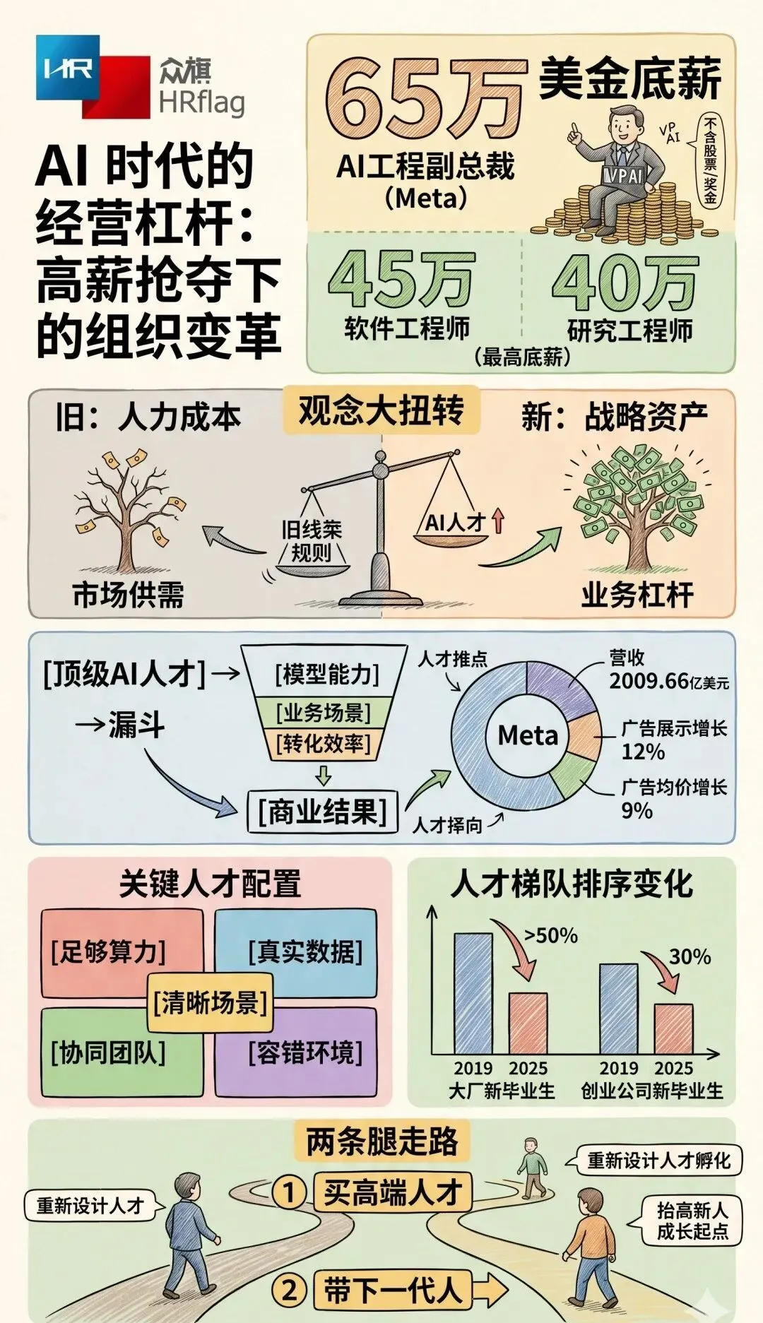 回到Meta这件事本身,65万美元底薪之所以引发巨大关注,本质上是因为它把一个原本只在董事会、投资人和顶尖猎头圈子里讨论的问题,直接公开给了所有管理者:当技术成为收入的放大器,人才价格就会率先重估;当人才价格被重估,组织规则就必须跟着重写。如果一家公司的业务增长越来越依赖模型、自动化和智能决策,那么它就不可能继续用过去那套平均主义、静态化、低弹性的薪酬和用人逻辑来管理未来。
