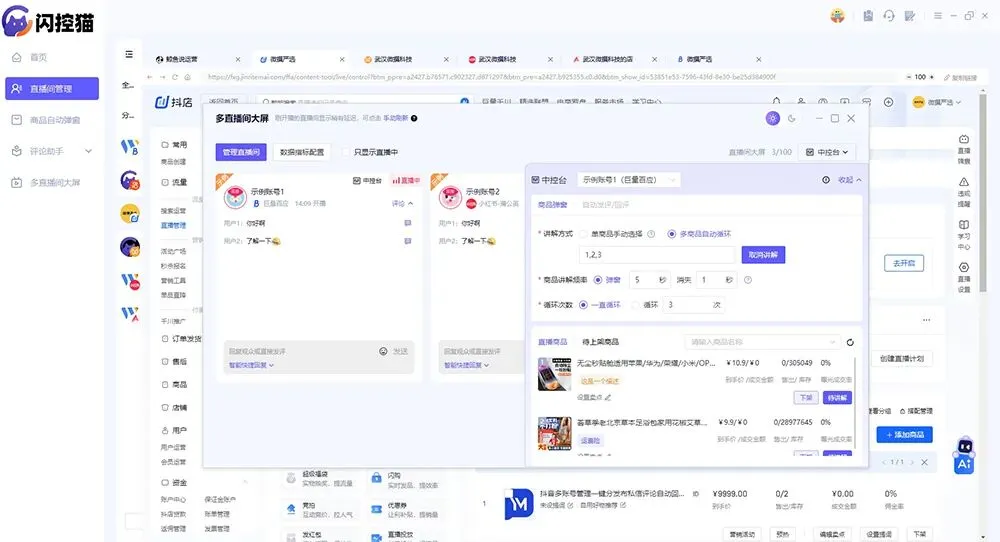 第一个层面,是解决“手忙脚乱”的问题。一个主播或中控,在直播时要盯着评论区、要看实时数据、要手动弹商品、要回复问题,恨不得长出三头六臂。这就好比一个厨师,既要炒菜,又要切菜,还要招呼客人,哪样都做不精。你需要一个帮你“打下手”的工具。比如,很多团队在用闪控猫这样的直播聚合中控,它就能帮你自动完成商品弹窗。你可以提前设置好讲解顺序和间隔时间,到点自动弹出,讲解节奏稳了,主播就能更专注在讲品和互动上。这就像给厨师配了一个自动切菜机和传菜机器人,他只需要专注在火候和调味这道核心工序上。