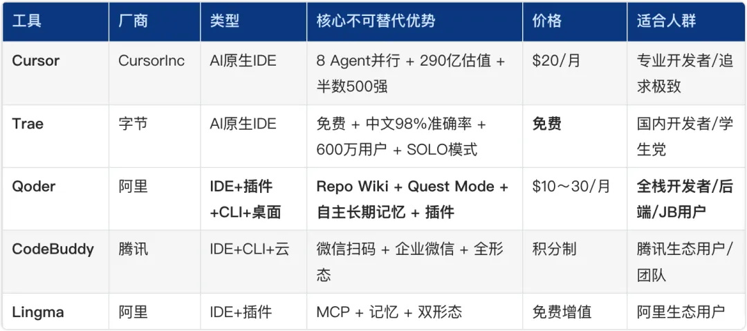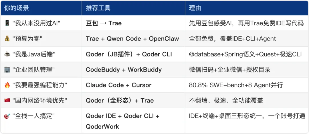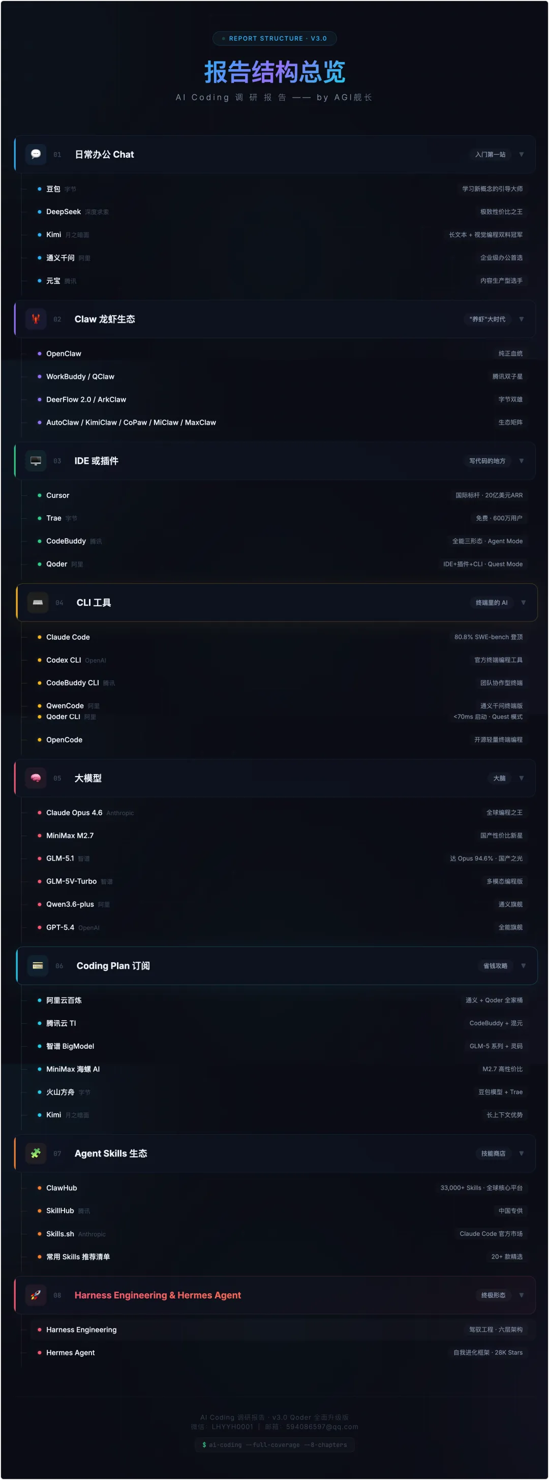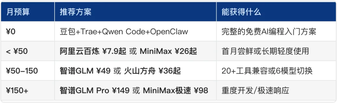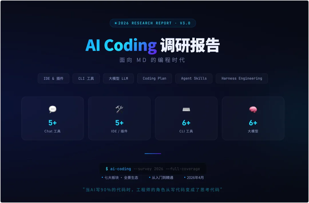 日常 Chat 工具:豆包、DeepSeek、Kimi、通义千问怎么选? IDE/插件:Cursor、Trae、CodeBuddy、Qoder、Lingma各有什么坑? CLI:Claude Code 真的值得用吗? 编程大模型:选模型到底怎么选? Coding Plan:怎么花最少的钱,用最强的模型? AI Coding 实战与成本 ROI 计算 AI Coding 安全以及解决方案(企业工作者必看,这部分下篇文章更新)