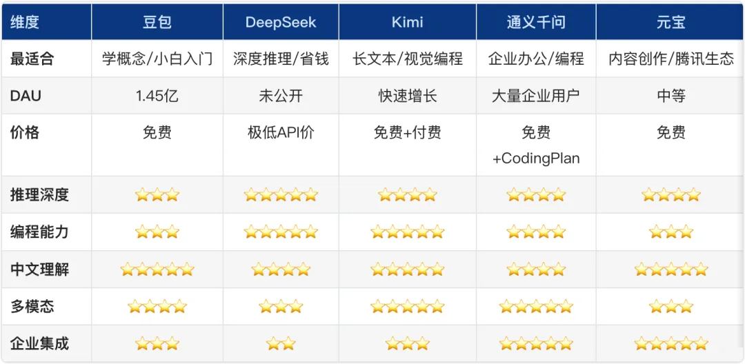 你的需求是什么?├── "帮我读这篇20万字的论文" → Kimi(长文本无敌)├── "帮我根据这张设计稿写代码" → Kimi K2.5(视觉编程独步天下)├── "帮我想一个产品创意" → 豆包(引导式发散思维)├── "帮我证明这个数学定理" → DeepSeek(推理链清晰)├── "帮我写一份企业周报" → 通义千问(阿里办公套件集成)└── "帮我在微信群里发个通知" → 元宝(腾讯生态打通)