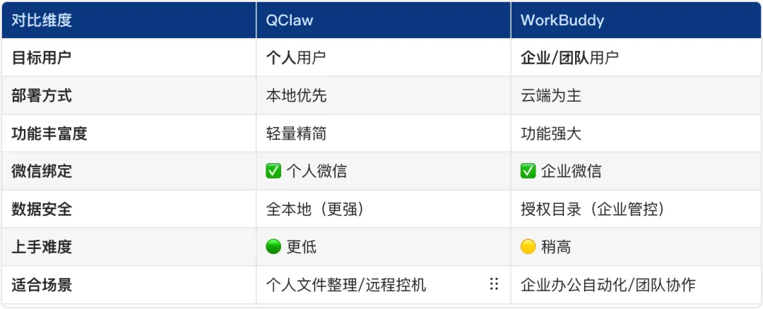 - 企业管控优先:WorkBuddy(授权目录+企业微信+审计)