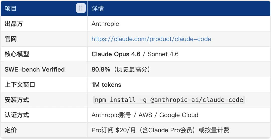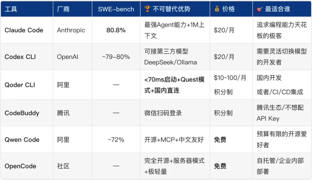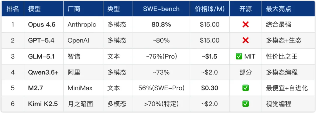 - 编程能力最强:Claude Code(80.8% SWE-bench,行业天花板)