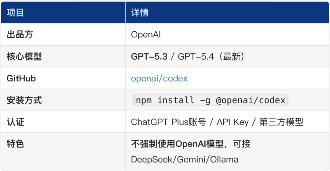 - 灵活模型切换:Codex CLI(接DeepSeek/Ollama等任意后端)
