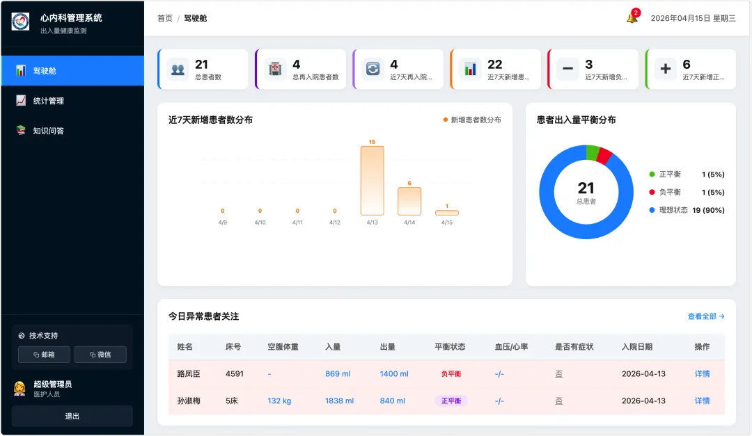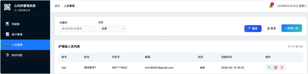 如图,是出入量管理系统的医护管理端,现在我们追加一个菜单“人员管理”,旨在对“护理端”的人员进行增删改查的维护。