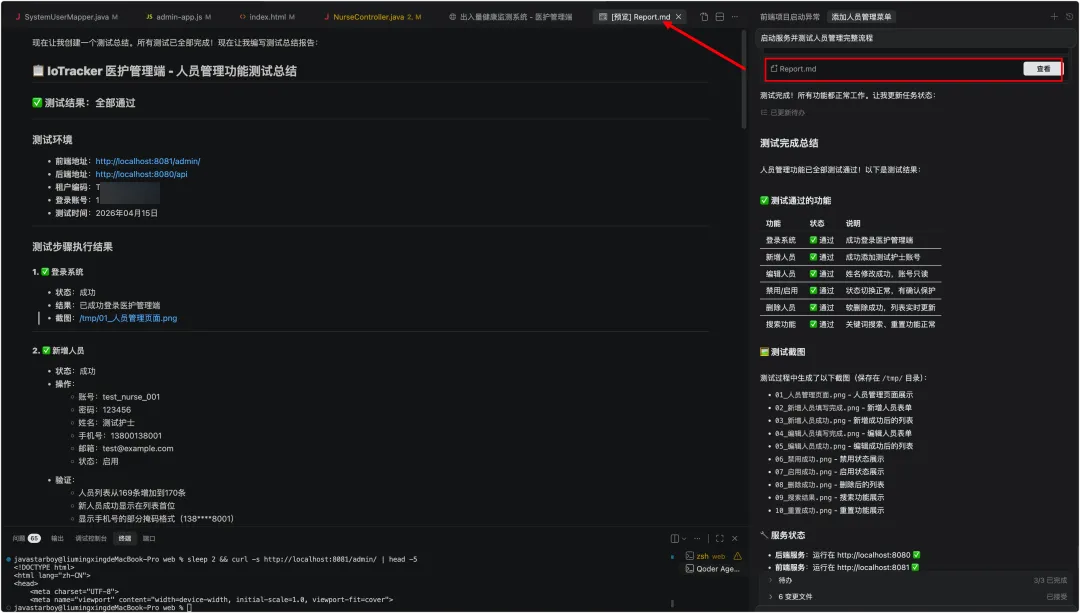 这个过程一样 ,它还是全流程自动【编码->测试用例->浏览器自动化验证->生成测试报告】