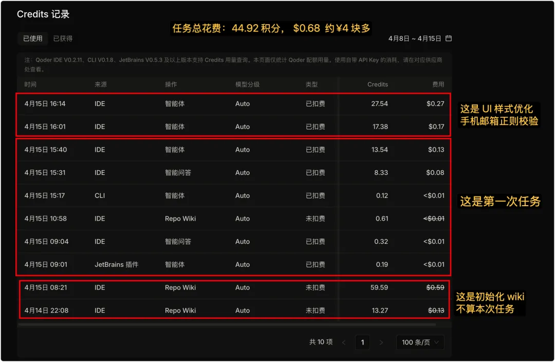 前面一次性初始化 Repo Wiki 不算本次任务 本次任务共计花费 45 积分,约人民币 4 块多(详情如图) - 耗时(从沟通到开发到测试完成):