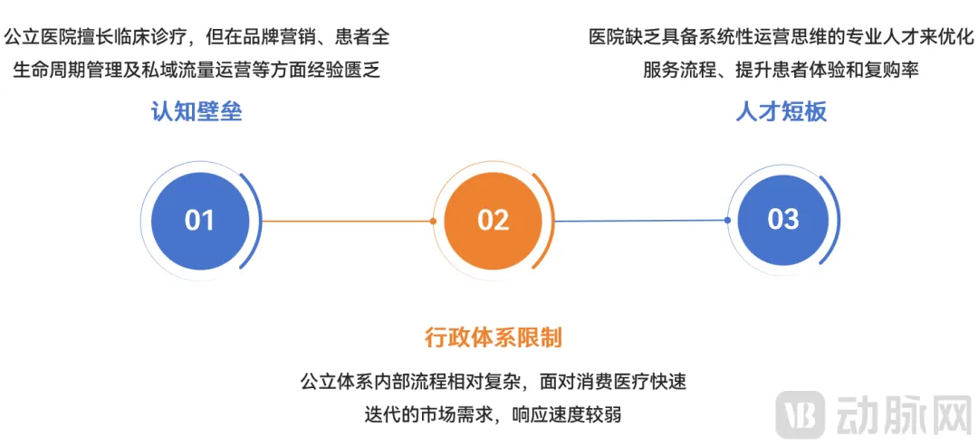 但不容忽视的是,公立医疗体系固有的行政化运行逻辑,导致其在消费医疗业务拓展中面临诸多瓶颈——繁琐的项目挂网审批流程、市场化营销能力缺失、流量获取与转化效率偏低、1V1服务能力不足等问题,严重制约了优质医疗资源的市场化变现。