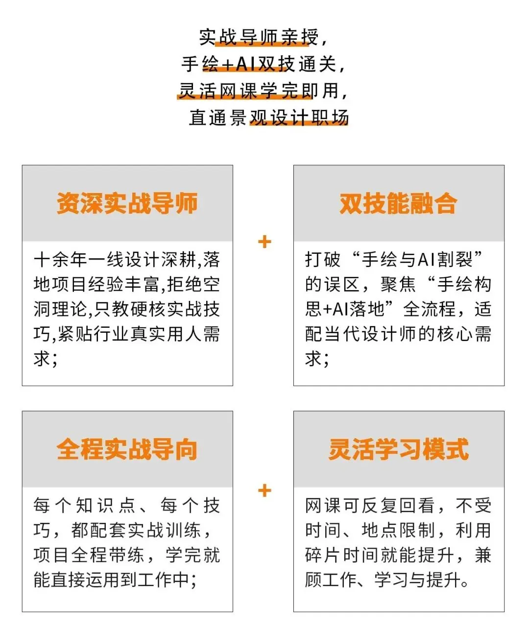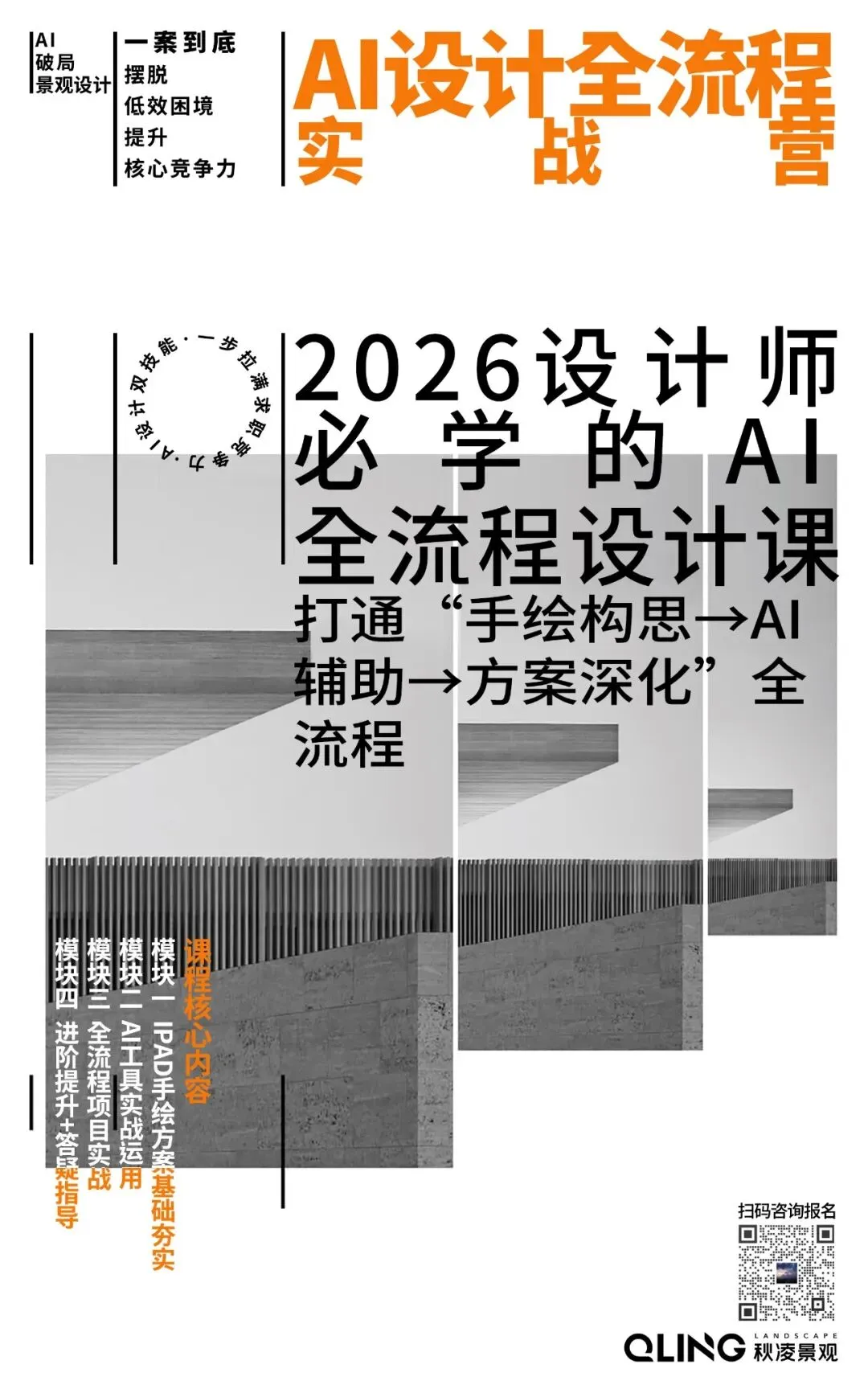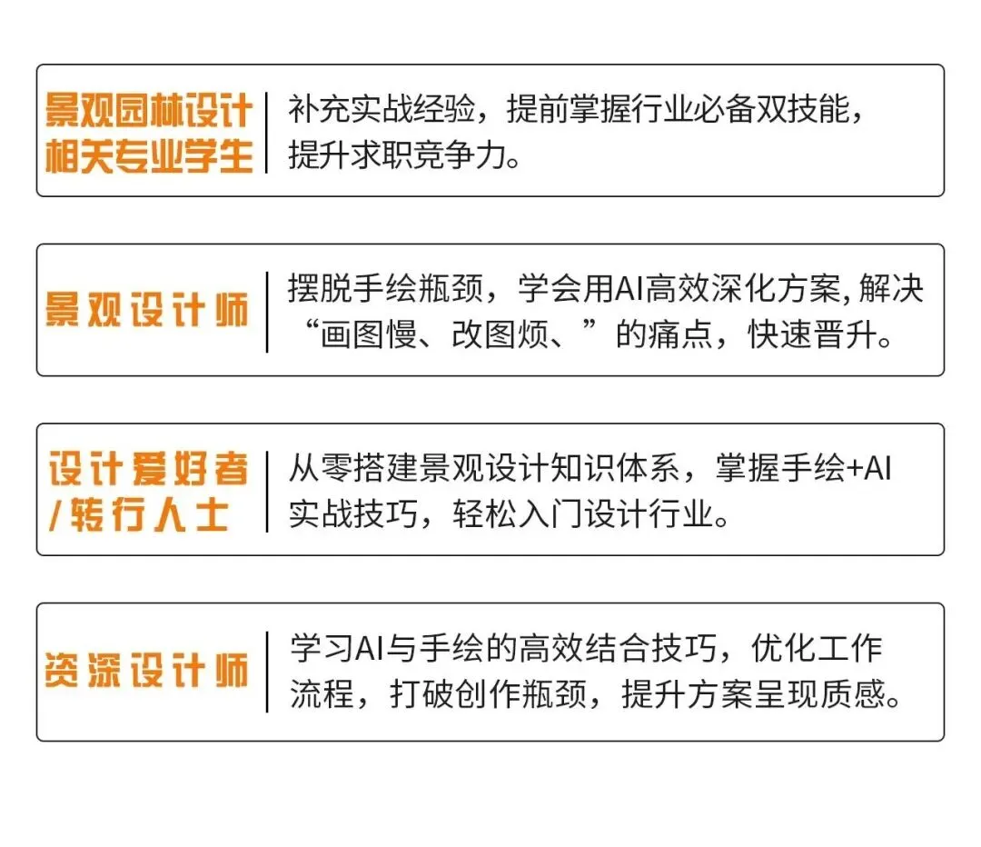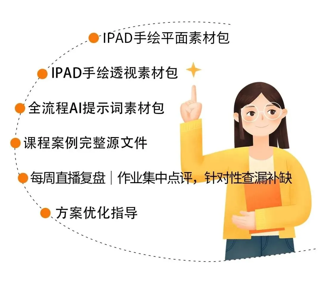 从场地分析、方案构思,到手绘平面草图、AI深化平面,再到效果图辅助呈现、全程带练;