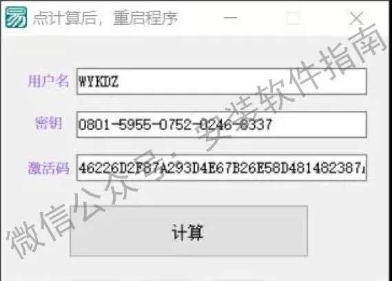 13.点计算生成用户名、产品密钥和激活码,点计算后软件会自动关闭,我们需要再重启一下