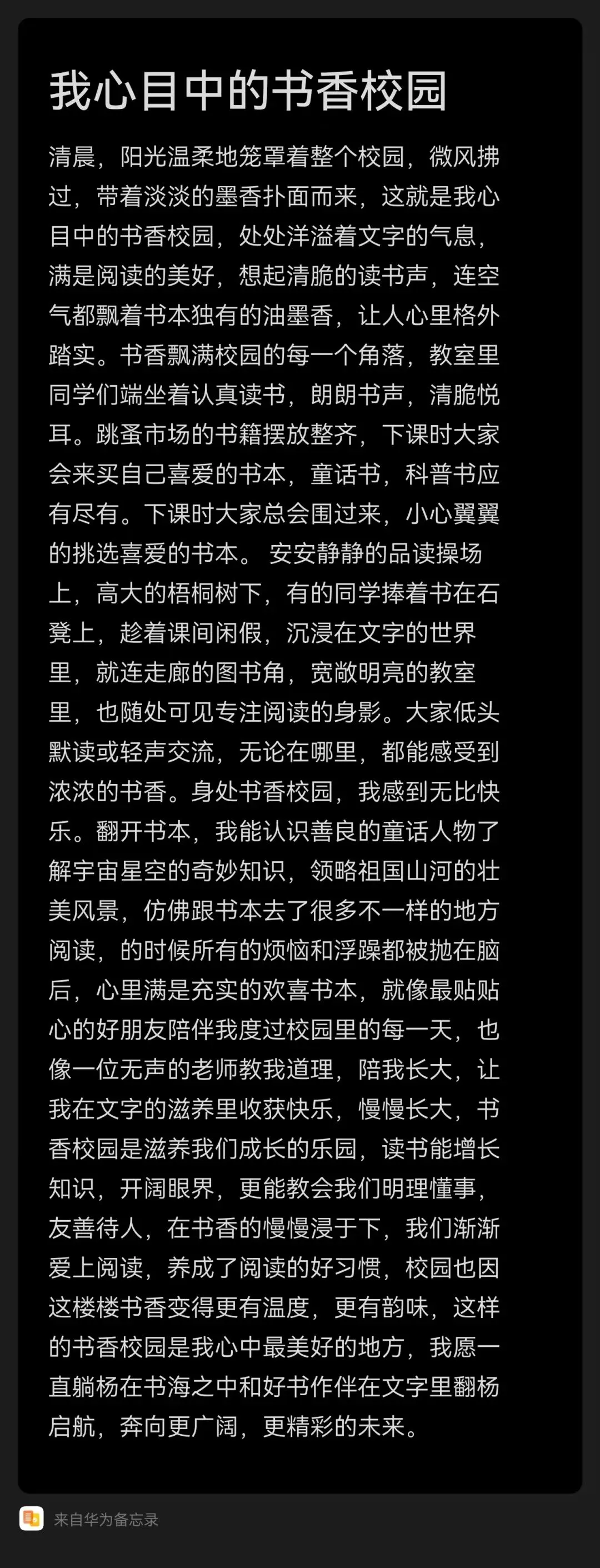 上周末闺女写《心目中的书香校园》征文,我周五下午6点半左右告诉她截止时间是周六中午前,她2个小时后给我发来习作图片。当天晚上我乘飞机去重庆,抵达重庆酒店晚上10点半。我一看她的习作,一股儿AI味儿扑面而来:习作没有儿童的语言特点、没有闺女的生活经历、放之四海而皆准的道理罗列不少……太晚了我没有回消息。第二天早上6点40分,相同的内容闺女又一次发给我。