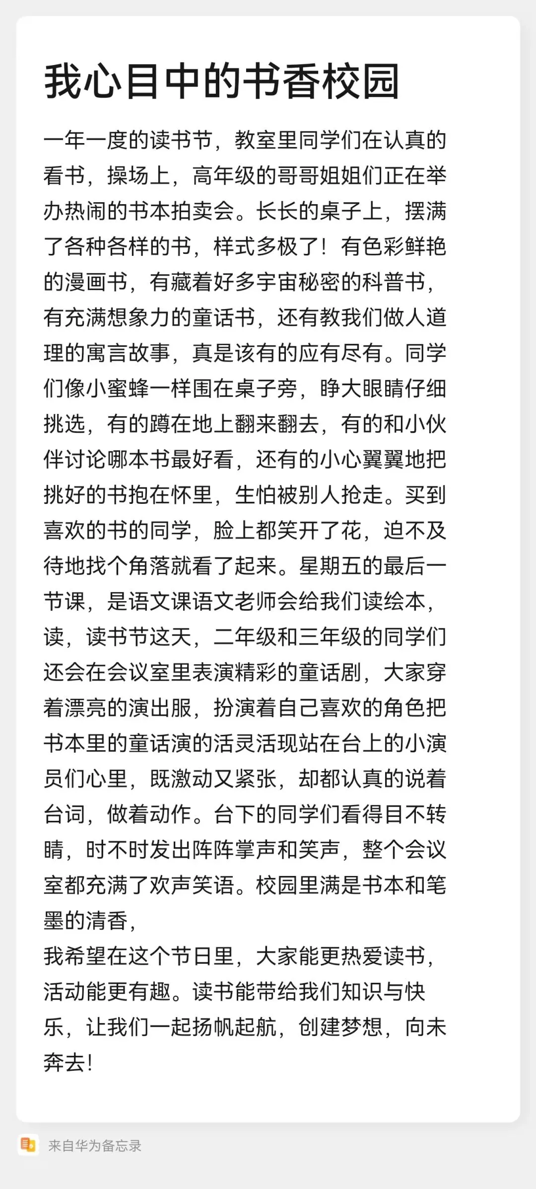 7点20分听讲座前我给闺女视频聊天,我直接问闺女:“有没有借助手机?”闺女说:“妈妈,时间有点赶,我怕写不完。求助了豆包……”我说:“别着急,你先自己想一想平常读书、校园读书节的情景,即使求助豆包,你也得先有自己的思路,写出自己的感受、期待……”闺女说:“乔老师课上给我们罗列了一些内容,我想起来了……”大约9点40,讲座中场休息时间,闺女发来了第二次习作,她说利用手机语音转文字功能很快完成了。我看了内容,心想这才对嘛,文中闺女听乔老师读绘本、闺女参加绘本剧表演、闺女去校园跳蚤市场买书……都是闺女的生活经历。虽然与题目“我心目中的书香校园”有些不符,容易让人有“偏题”的感觉,题目侧重想象、理想的场景,习作都是客观、真实的场景。我看出了问题,就利用Kimi进行修改,我把闺女的第二次习作图片上传,说出自己的修改要求,强调以上传内容为基础尽量保持原文内容。Kimi很给力、很精妙,它给出这样的表达:这(现实的读书生活、校园读书节一系列活动)就是我想要的书香校园,并陈述了一些理由。