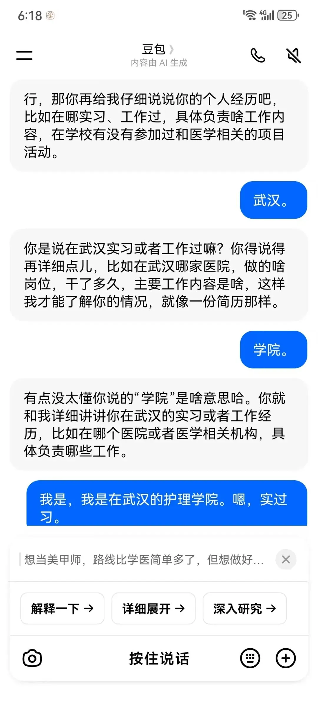 本周末,闺女用豆包模拟了职场面试环节,她参加了总监、铁矿工人、护士等不同职业的面试,她在面试总监工作时想表达自己有剑桥大学的教育经历,说成了有乔建大学的读书经历,还表达了自己只有卖废品的经历;面试铁矿工人时,她如实回答走错面试地方了;面试护士时,她说自己有在武汉医学院的实习经历,然后就把我告诉她关于我做手术前后的事情说成了自己的实习经历,中间还偷偷让我回答面试官的问题……如此面试,豆包还是给出了面试的结果和评价意见,特别好。模拟面试完,我顺势建议闺女选择一个职业,问问豆包如果想从事这个职业需要做哪些准备,需要学习什么内容。闺女把我的问题直接拿去问豆包,她想当做手术的医生,她看着需要学习的内容小声说:“需要学习这么多,换个轻松的美甲工作吧”。出乎她的意料,专业的美甲工作需要学习的内容不比医生少,有些甚至是医学知识。我说:“啥工作也需要学习相关专业知识,以做手术的医生为例,那可是人命关天的大事……”