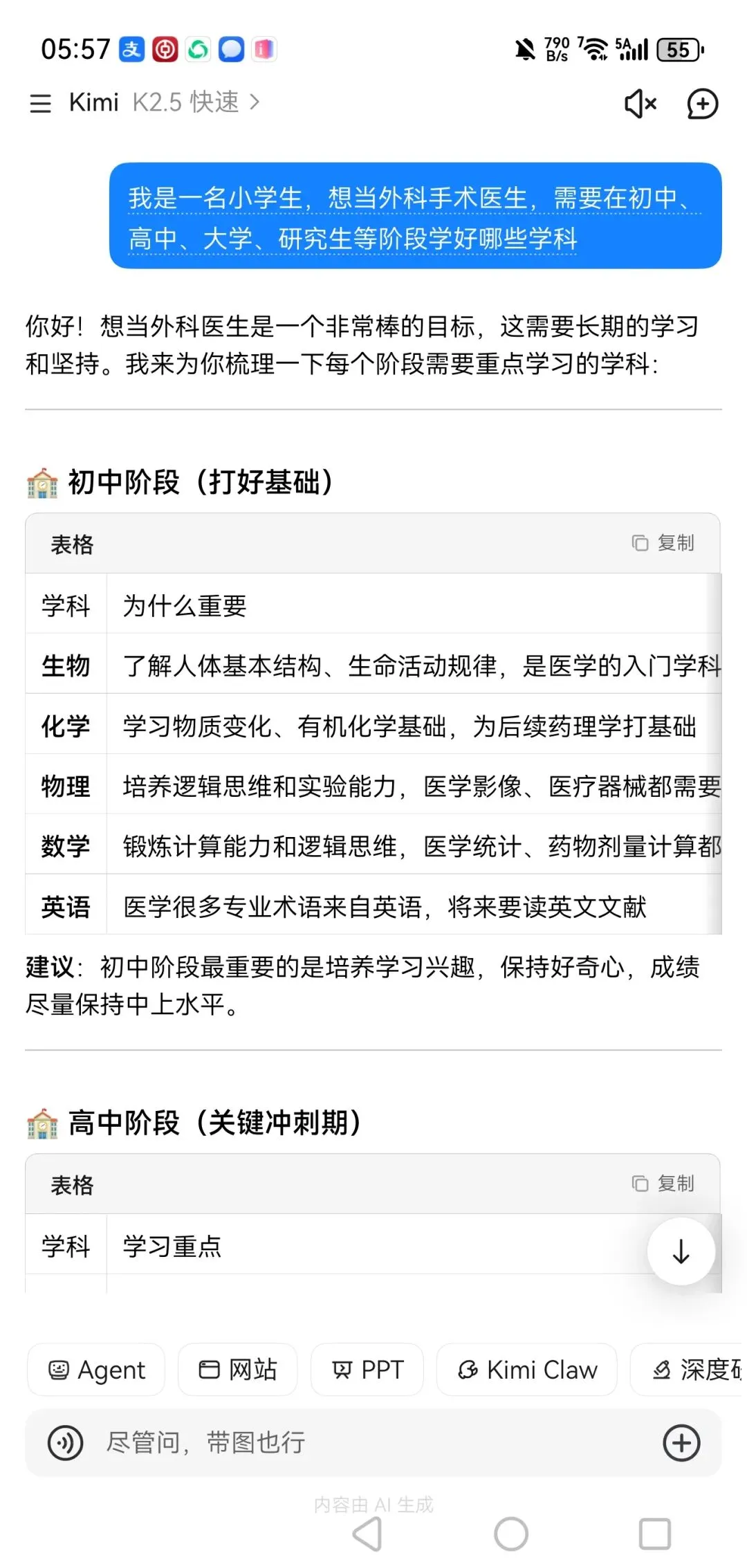 我用Kimi了解了成为医生的必要准备及必经路径,我先说明自己是三年级学生,我想了解成为医生在初中、高中、大学的必学课程……我把自己查询的结果让闺女看,我说:“其实,当医生还好,你看物理、数学、生物、英语都是你初中、高中必学科目,大学甚至研究生时期也是学习以这些学科为基础的医学知识。再看看美甲,很多工作时用到的知识与初高中的基础知识联系不大……”
