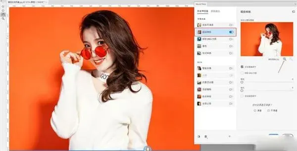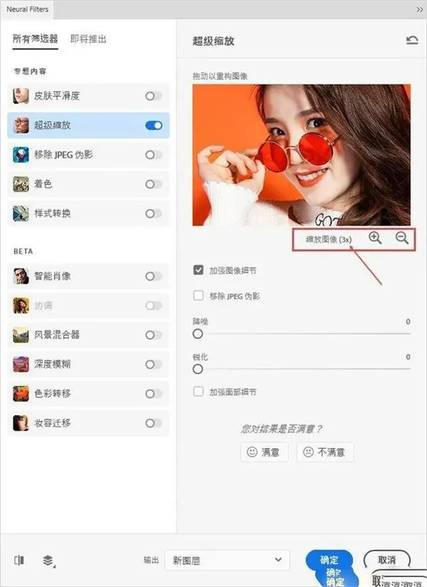 Neural Filters 通过生成新的像素来帮助您优化、处理和修改图像,新产生的像素实际上不存在于原始图像中。超级缩放1、这个功能可以把它理解为放大后自动磨皮,这个功能适合将尺寸较小的的时候放大细节