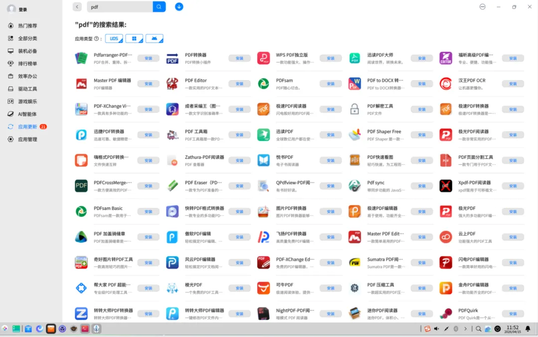 再给大家举另外一个例子,统信商店,输入一下PDF关键字。如下图: