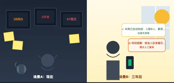 场景B:三年后周一早上,李总的手机震动了一下:"本周已自动完成:入职9人、薪资核算全量通过、社保无异常。特别提醒:候选人张某履历存在3个月空档,建议人工复核;海外事业部申请突破薪酬上限录用人才,是否授权?"
