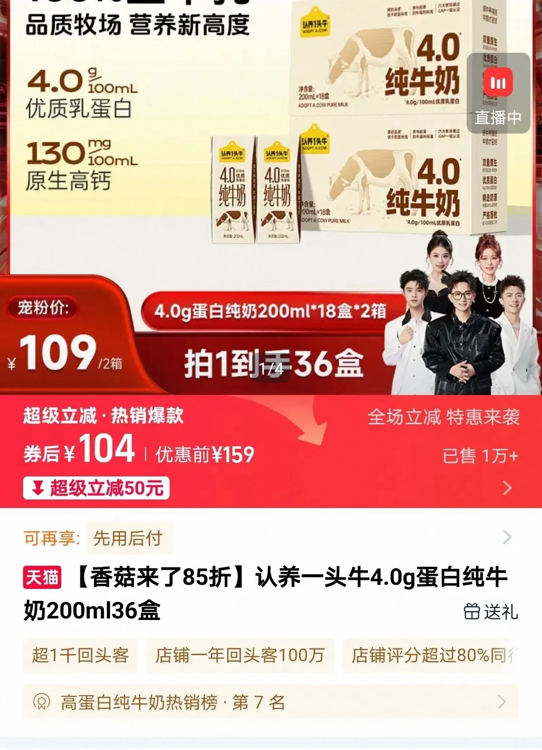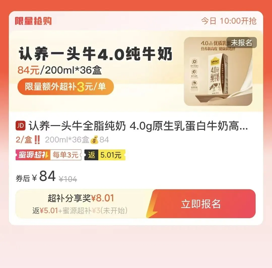 例如下图这个牛奶一箱是36盒,某宝上售价154元,领劵后购买104元,我复制链接到蜜源查找,走蜜源购买84元,且额外还可以获得8元分享奖励。
