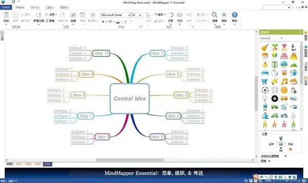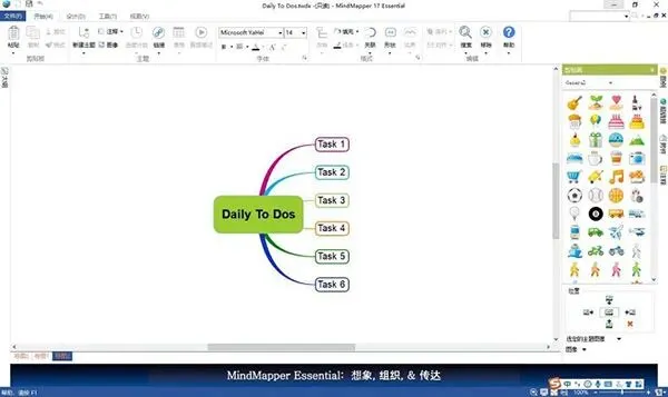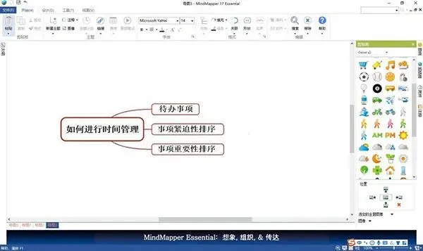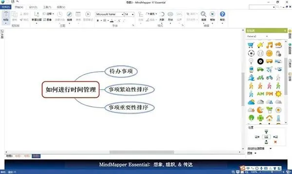 3、在MindMapper里,直接点击主题就可以进行内容的输入以及修改。我们还可以直接拖动添加右边的“剪贴画”代替文字给图表增加趣味性。4、如果想修改模板的格式,可以通过点击MindMapper中的“形状”,“线条”等格式选项对选中的主题进行修改。比如,我们可以将“高效工作”的方框格式更改为立体圆柱格式。