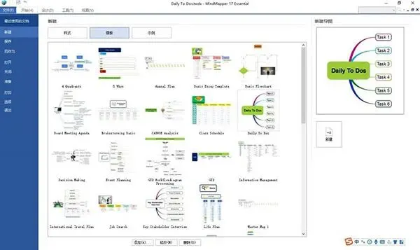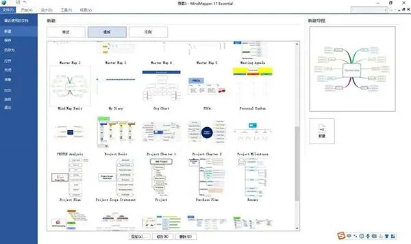 1、在MindMapper里,我们有两种方式创建树状图,这两种方式分别是样式创建,以及模板创建。创建的方法都是通过点击左上角的“新建”获取导图构建选项,然后在右边的新建选项列表中选择“样式”或者“模板”创建。