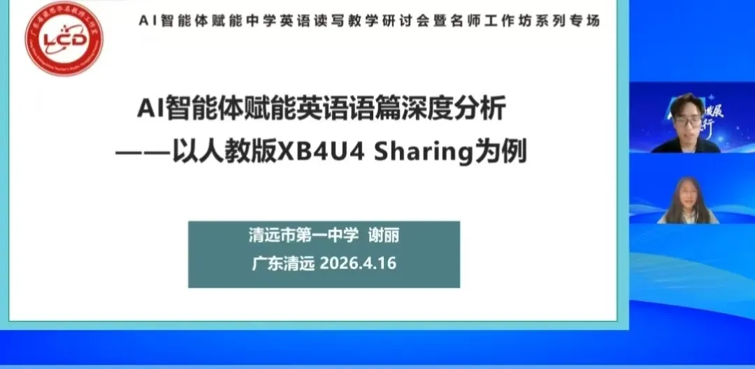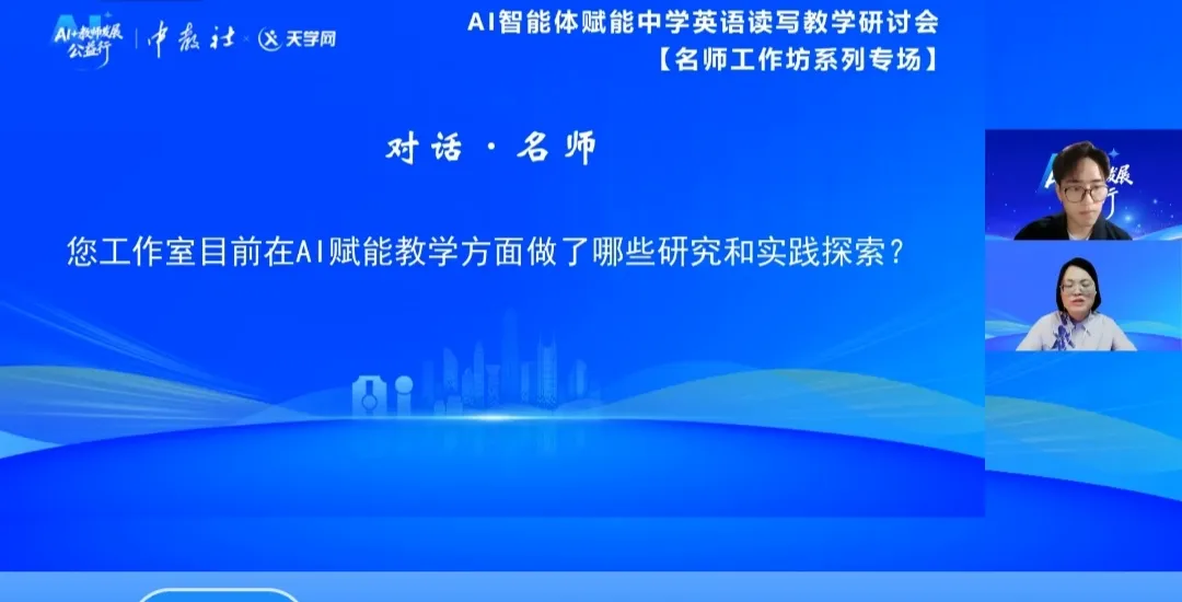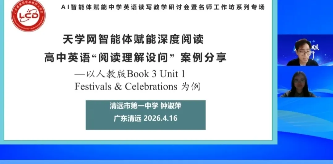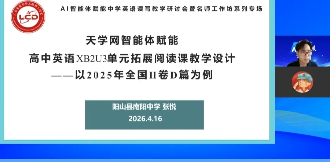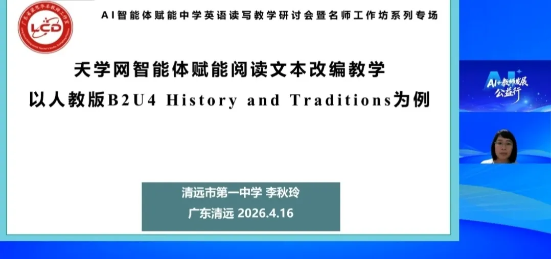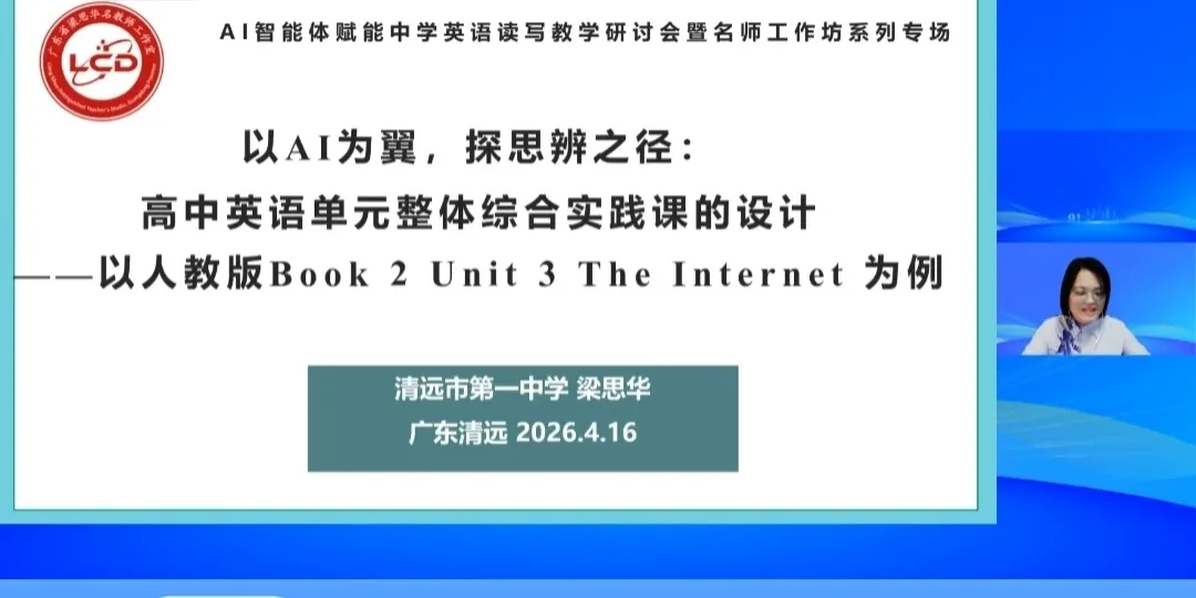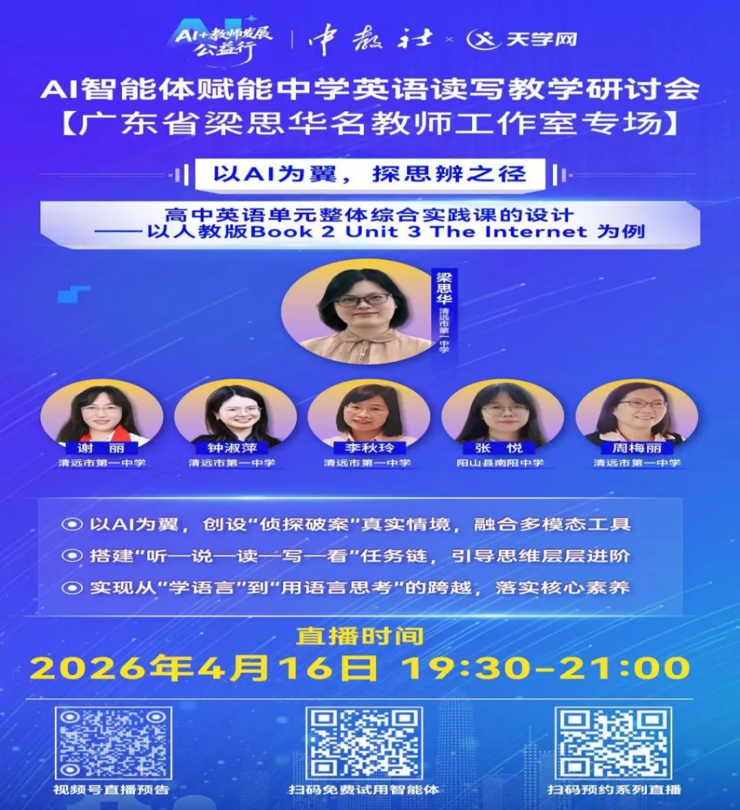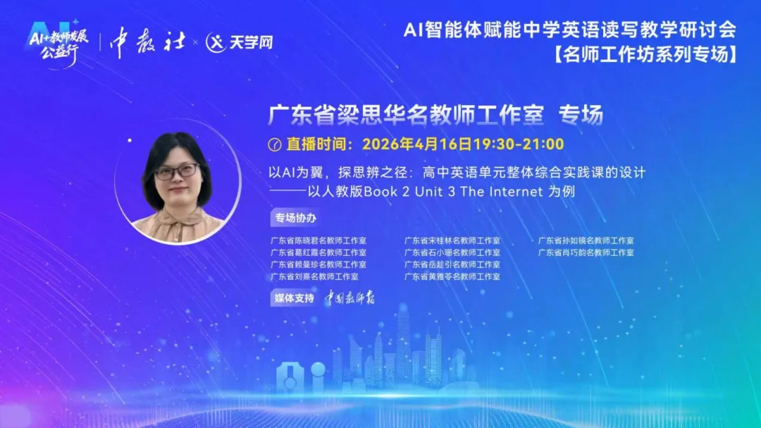 为深入贯彻落实《教育强国建设规划纲要(2024—2035年)》、《国务院关于深入实施 “人工智能 +”行动的意见》、《关于加快推进教育数字化的意见》等文件精神,积极践行新版义务教育与普通高中英语课程标准中发展学生核心素养、深化教学变革的要求,着力破解一线教师在素养导向教学、精准评价与高效备课中面临的现实困境,充分发挥名师工作室示范、引领、辐射作用,2026年4月16日,由中教社、天学网・人工智能研究院主办,广东省梁思华名教师工作室承办,中国教师报提供媒体支持的“AI 智能体赋能中学英语读写教学研讨会” 专场活动顺利举行。本次线上直播吸引了众多一线教师在线观看,共探“AI + 大单元”英语教育创新路径。