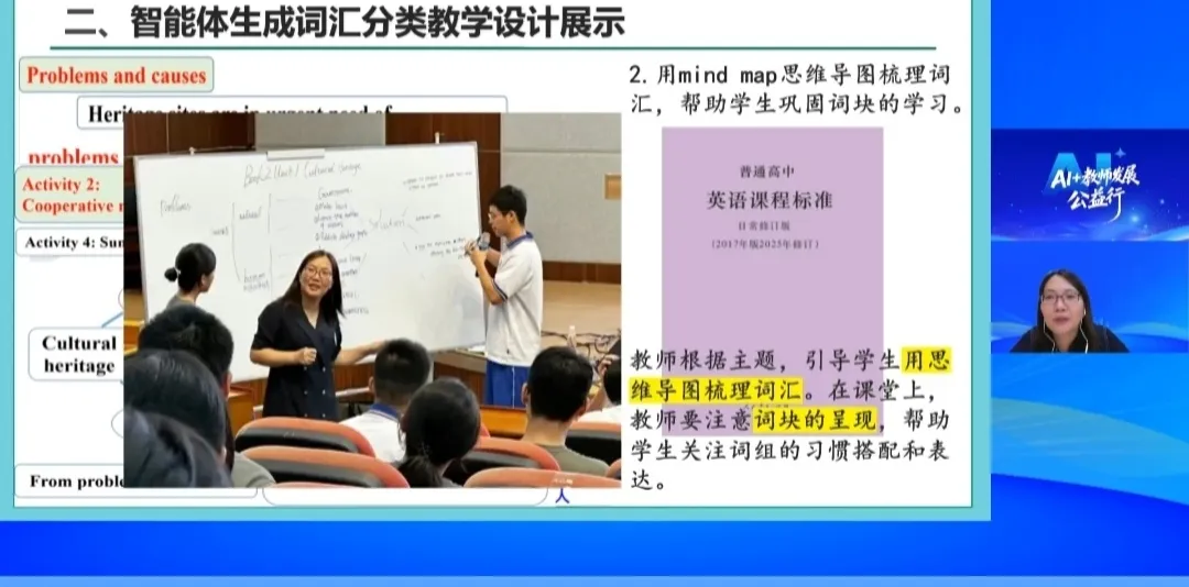 基于AI输出的三维分析报告与教学设计框架,谢老师构建五步闭环课堂,实现AI全程赋能。她提出,AI时代教师应转变为学习设计者、思维引导者、成长陪伴者,借助AI提升备课效率与文本分析精度,推动英语学科核心素养落地课堂。