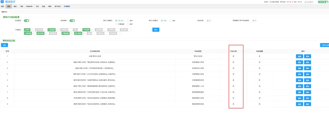 - 创建预定之前会判断库存,如果库存不足,则根据配置(自动关房),自动打开OTA库存管理页面,尝试关闭对应日期的对应房型,并消息提醒关房。创建预定之后,如果检查房型库存为零,且未配置可以升房时,会自动尝试关闭OTA房型,并消息提醒。库存检查自动执行时,会检查PMS中库存为零且未配置升房的房型,然后根据配置(自动关房),会自动尝试关闭OTA房型,并消息提醒。