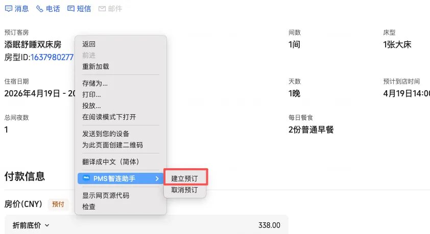 - 当机器人自动接单后,会打开一个新窗口,打开PMS页面,会首先检查库存是否足够,库存不足会提醒人工操作。库存充足时则打开新建预定页面,自动填入订单信息,包括入住人姓名(拼音),入离时间,房型与付费房型,价格代码,订单备注,固定收费,关联信息和联系人档案(旅行社),分账指令等信息。并将外部确认号回填至OTA订单页面。
