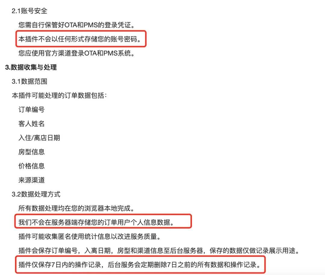 如果您担心使用这款机器人把自己的OTA账号信息泄露出去,这个不用担心哦!基于浏览器的安全机制,我们是无法获取您的账号信息的哦。我们也没有理由去做这个事儿的,使用协议中有注明的,信息安全请您放心:使用了这款PMS机器人之后,前厅人员在边处理预订边接待入住人员时从容多了。前厅人员也省了比较多的工作量,可以腾出手来干其他事,把更多精力关注到更有价值的事情上去。我们提供了一个月的试用期,不满意,不收费,随时退费等措施。如您有任何新的需求,也可以反馈给我们,我们将免费帮您实现。
