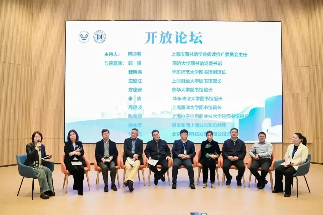 开放论坛由上海市图书馆学会阅读推广委员会主任蔡迎春主持。同济大学图书馆党委书记郭骧、华东师范大学图书馆副馆长魏明扬、上海财经大学图书馆馆长应望江、东华大学图书馆馆长方建安、华东政法大学图书馆馆长朱俊、上海海洋大学图书馆馆长高晓波、上海电子信息职业技术学院图书馆馆长陈克明,以及超星集团上海分公司总经理徐兆寿、北京元阅科技发展有限公司总经理黄湘元,围绕《全民阅读促进条例》实施后高校图书馆阅读推广创新路径展开深度对话。