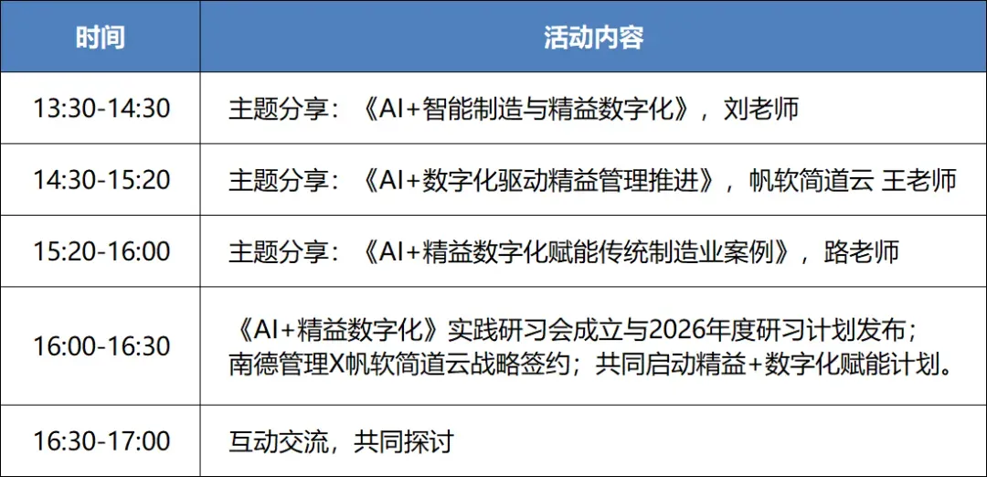在“中国制造+互联网+AI”的新模式与新路径下,企业如何借助AI技术打通产业链信息孤岛、实现流程透明化、促进跨部门协同互动,推动精益管理数字化升级?南德管理将联合帆软简道云,带您学习最前沿的AI+精益数字化转型升级之道,依托AI赋能破解企业发展难题、把握时代机遇。