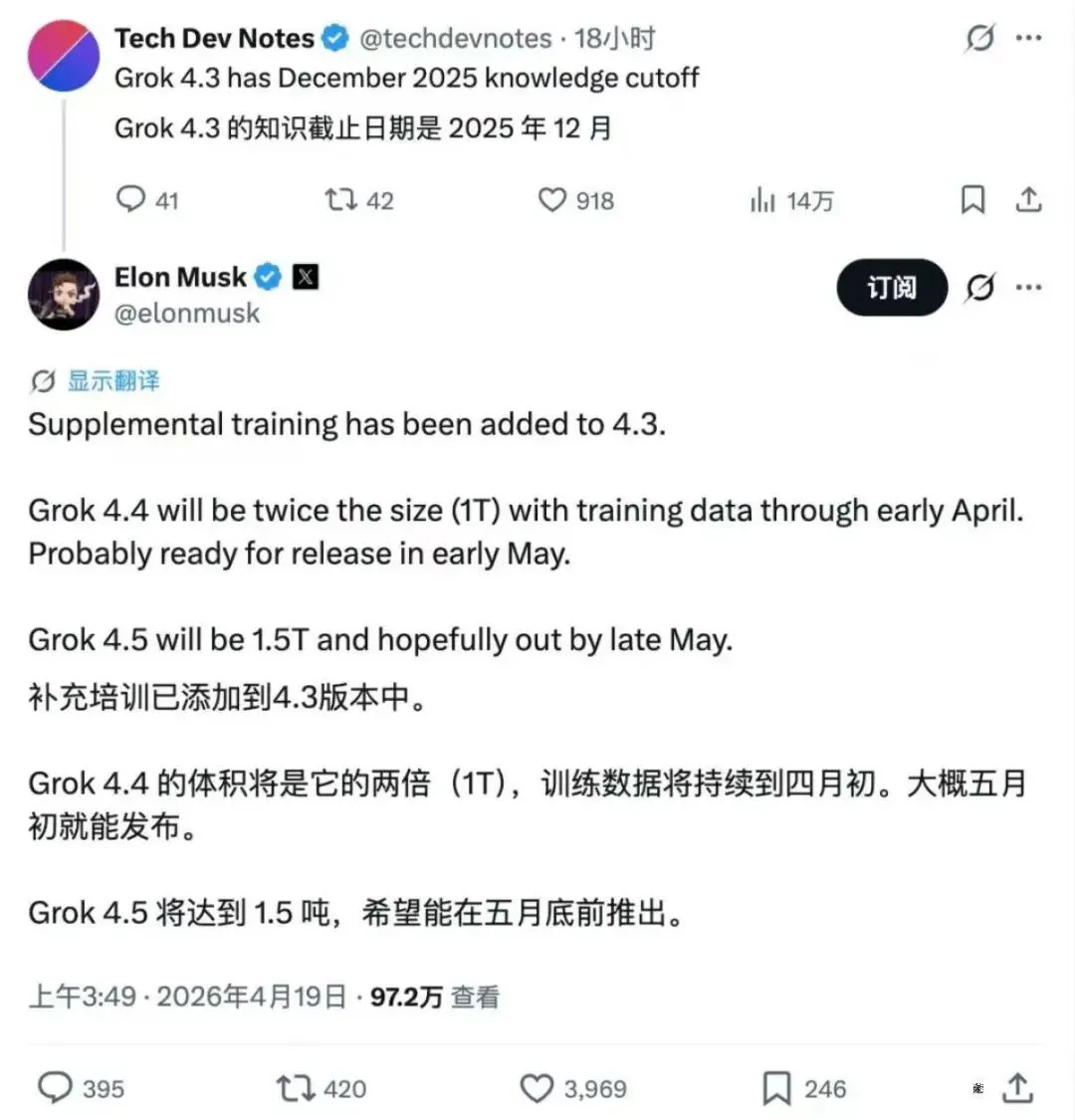 马斯克在 X 平台公布了 Grok 系列大模型的详细迭代计划,为这款 AI 模型的后续发展划出了清晰的时间线。目前 Grok 4.3 已经进入追加补充训练阶段,这一步旨在优化模型的现有性能,通过针对性的数据输入与参数调整,为后续版本的迭代打下更坚实的基础。作为此次计划中的核心节点,Grok 4.4 将把参数规模翻倍至 1T,训练数据覆盖范围延伸至 2026 年 4 月初,预计在今年 5 月初正式发布。这款模型正是马斯克此前提及的 1T 旗舰产品,他明确表示,Grok 4.4 将在编码能力、长上下文处理以及综合技能上实现阶跃式提升,这意味着用户在代码编写、长文本理解与生成、复杂逻辑推理等场景中,将获得更高效、更精准的 AI 辅助。