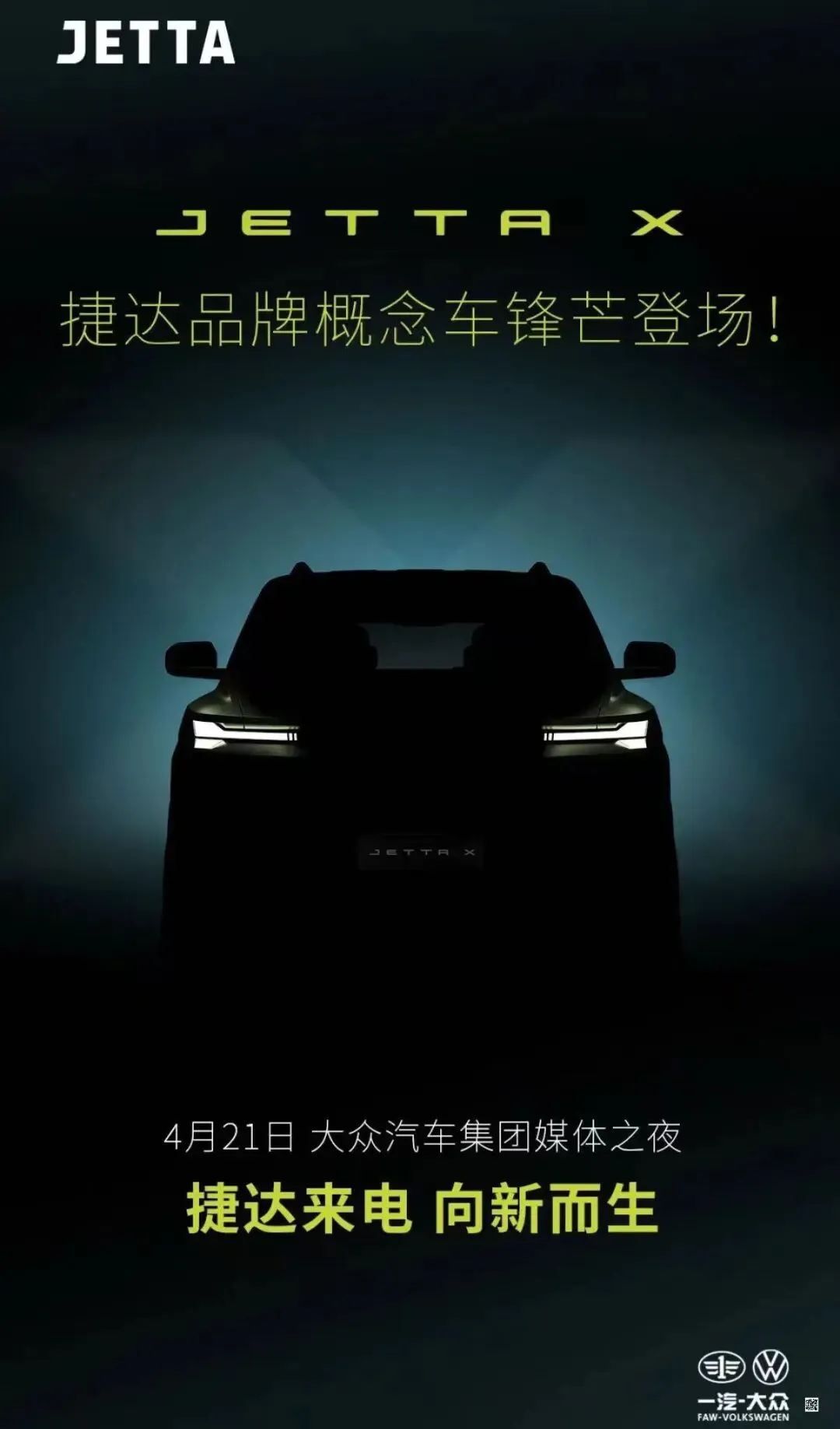 一汽 - 大众旗下捷达品牌正式发布全新概念车 JETTA X 的预告视频及多张预告图,这款承载品牌转型使命的车型,将于 4 月 21 日举办的大众集团媒体之夜完成全球首秀。JETTA X 概念车以方正硬朗的整体造型,跳出了捷达以往的家用车风格。前脸设计尤为吸睛,凌厉的分体式灯组搭配隐藏式主大灯,锐利的日行灯线条与隆起的机盖线条相互呼应,同时取消了传统燃油车的进气格栅,完全契合纯电车型的设计语言,黑色前包围进一步强化了车头的力量感。车身侧面,多组棱线勾勒出十足的肌肉感,修长的车身比例预示着车内将拥有宽敞的乘坐空间,平直的 D 柱设计则可能带来宽大的后备厢空间,甚至有传闻称新车有望提供三排六座布局。车顶配备的行李架兼顾了实用性,轮拱处的黑色防擦材质搭配大尺寸轮毂,让整车呈现出向前俯冲的运动姿态。