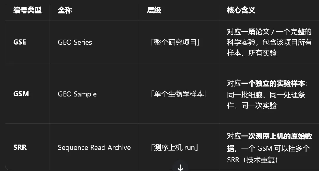 o同一个 GSMxxxxxx 下列出的多个 SRR,通常属于同一个样本的不同测序 run(技术重复)。