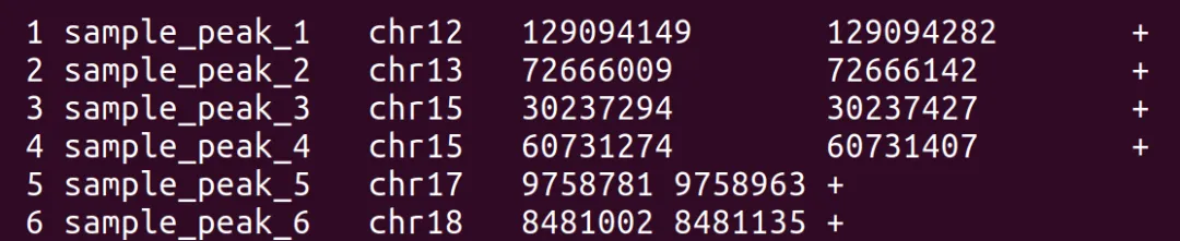 # sample_peaks.narrowPeak 是 MACS2 / MACS3 输出的核心结果文件