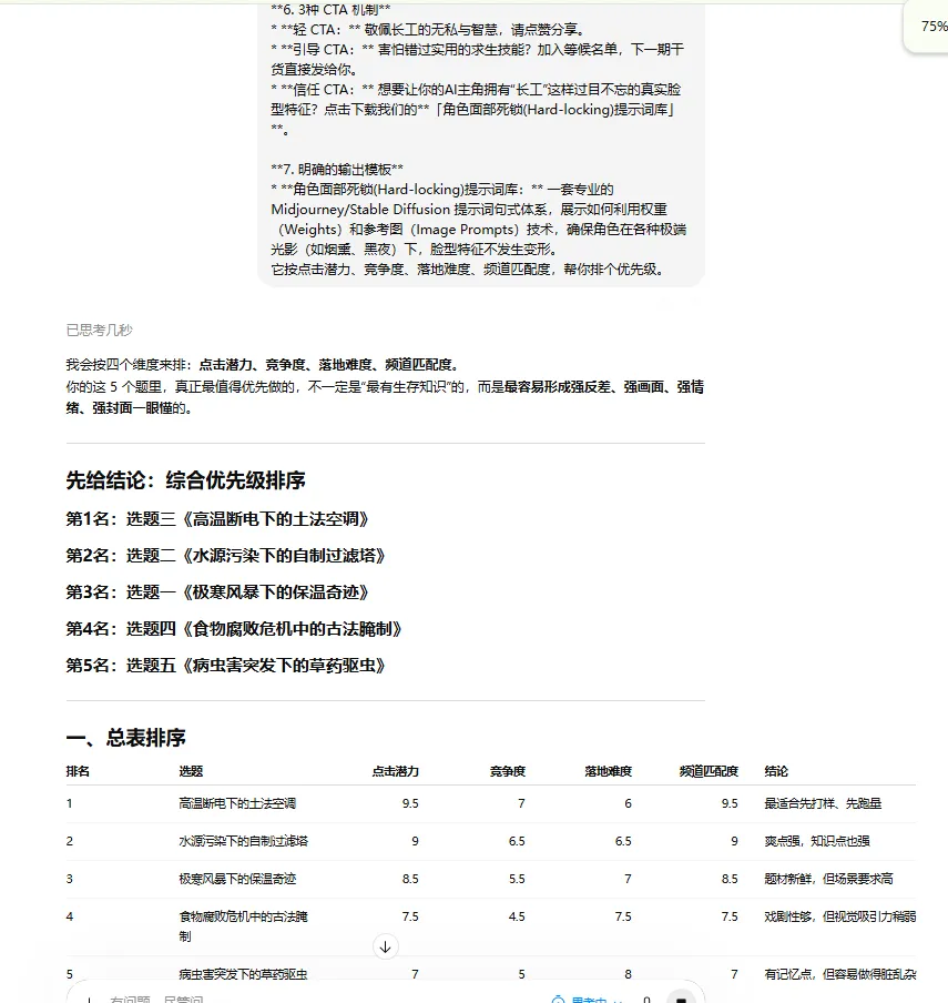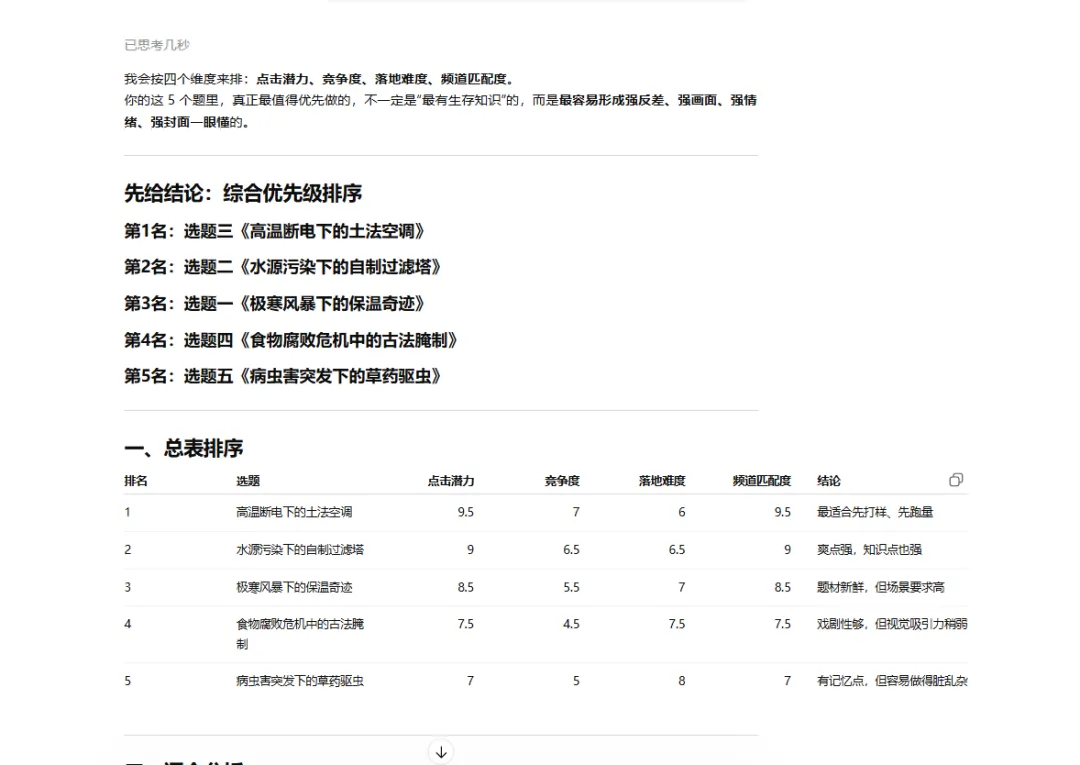 直接把这 5 个选题再丢给 ChatGPT,让它按点击潜力、竞争度、落地难度、频道匹配度,帮你排个优先级。