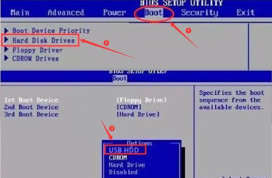 第二种:进入电脑Bios设置U盘为第一启动项(第一种方法使用快捷键启动无法选择U盘时用此方法设置)。由于不同电脑进入Bios设置U盘启动各有差异,以下仅供参考(建议用户根据自己的电脑品牌自行搜索设置方法)。开机出现Press“ F2” to enter SETUP 时,按F2键(具体以自己的电脑开机显示为准)。按键盘上的方向键切换到“BOOT”项,点击“Hard Disk Drives”,将“1ST BOOT” 修改为“USB HDD”按F10保存更改,重启时就会自动载入U盘。