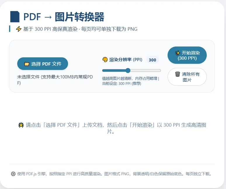 <!DOCTYPE html><htmllang="zh-CN"><head> <metacharset="UTF-8"> <metaname="viewport"content="width=device-width, initial-scale=1.0"> <title>PDF转图片 - 300 PPI</title> <!-- 引入 PDF.js 核心库和渲染器 --> <scriptsrc="https://cdnjs.cloudflare.com/ajax/libs/pdf.js/2.16.105/pdf.min.js"></script> <scriptsrc="https://cdnjs.cloudflare.com/ajax/libs/pdf.js/2.16.105/pdf.worker.min.js"></script> <style> body { font-family: Arial, sans-serif; margin: 20px; background: #f0f0f0; } .container { max-width: 1200px; margin: 0 auto; background: white; padding: 20px; border-radius: 8px; box-shadow: 0 2px 10px rgba(0,0,0,0.1); } input, button { padding: 8px 16px; margin: 10px 5px; font-size: 14px; } .preview-area { margin-top: 20px; display: flex; flex-wrap: wrap; gap: 20px; justify-content: flex-start; } .page-container { border: 1px solid #ccc; background: #fff; box-shadow: 0 2px 5px rgba(0,0,0,0.1); } .page-container img { display: block; max-width: 100%; height: auto; } .page-container p { margin: 5px; text-align: center; font-size: 12px; background: #eee; } .info { margin-top: 15px; padding: 10px; background: #e9ecef; border-radius: 4px; font-size: 14px; } .error { color: red; } </style></head><body><divclass="container"> <h2>📄 PDF 转图片(300 PPI 渲染)</h2> <inputtype="file"id="pdfInput"accept="application/pdf" /> <buttonid="convertBtn">开始转换(300 PPI)</button> <divclass="info"> ⚡ 说明:基于 PDF.js 渲染,<strong>300 PPI</strong> 表示每英寸 300 像素,根据 PDF 页面尺寸(英寸 = 点/72)自动计算图片宽高。<br> ✅ 生成的图片为 PNG 格式,可直接右键保存。 </div> <divid="preview"class="preview-area"></div> <divid="status"class="info"style="display:none;"></div></div><script> // 设置 PDF.js worker pdfjsLib.GlobalWorkerOptions.workerSrc = 'https://cdnjs.cloudflare.com/ajax/libs/pdf.js/2.16.105/pdf.worker.min.js'; // 辅助函数:将 PDF 页面渲染为图片(指定 PPI) async function renderPageToImage(page, ppi = 300) { // 获取页面原始尺寸(单位:点,1 点 = 1/72 英寸) const viewportOriginal = page.getViewport({ scale: 1.0 }); const widthInPoints = viewportOriginal.width; // 宽度(点) const heightInPoints = viewportOriginal.height; // 高度(点) // 计算英寸:点 / 72 = 英寸 const widthInInches = widthInPoints / 72; const heightInInches = heightInPoints / 72; // 根据目标 PPI 计算所需像素尺寸 const widthInPixels = Math.round(widthInInches * ppi); const heightInPixels = Math.round(heightInInches * ppi); // 计算缩放比例:目标像素宽度 / 原始点宽度 const scale = widthInPixels / widthInPoints; // 获取按比例缩放后的视口 const viewport = page.getViewport({ scale: scale }); // 创建 canvas 元素 const canvas = document.createElement('canvas'); const context = canvas.getContext('2d'); canvas.width = viewport.width; canvas.height = viewport.height; // 渲染 PDF 页面到 canvas const renderContext = { canvasContext: context, viewport: viewport, background: 'white' // 白色背景 }; await page.render(renderContext).promise; // 将 canvas 转换为图片数据 URL(PNG 格式) const imageDataURL = canvas.toDataURL('image/png'); return { imageUrl: imageDataURL, width: canvas.width, height: canvas.height, ppi: ppi, sizeInches: { width: widthInInches.toFixed(2), height: heightInInches.toFixed(2) } }; } // 主函数:加载 PDF 并转换所有页面 async function convertPDFToImages(file, targetPPI = 300) { const statusDiv = document.getElementById('status'); const previewDiv = document.getElementById('preview'); statusDiv.style.display = 'block'; statusDiv.innerHTML = '📖 正在加载 PDF 文件...'; previewDiv.innerHTML = ''; // 清空之前的内容 try { // 读取文件为 ArrayBuffer const arrayBuffer = await file.arrayBuffer(); // 加载 PDF 文档 const loadingTask = pdfjsLib.getDocument({ data: arrayBuffer }); const pdfDocument = await loadingTask.promise; const totalPages = pdfDocument.numPages; statusDiv.innerHTML = `📄 PDF 共 ${totalPages} 页,正在以 ${targetPPI} PPI 渲染...`; // 循环处理每一页 for (let pageNum = 1; pageNum <= totalPages; pageNum++) { statusDiv.innerHTML = `🎨 正在渲染第 ${pageNum} / ${totalPages} 页...`; // 获取页面 const page = await pdfDocument.getPage(pageNum); // 渲染为图片 const result = await renderPageToImage(page, targetPPI); // 创建页面容器 const pageContainer = document.createElement('div'); pageContainer.className = 'page-container'; pageContainer.style.marginBottom = '20px'; // 创建图片元素 const img = document.createElement('img'); img.src = result.imageUrl; img.alt = `第 ${pageNum} 页`; img.style.maxWidth = '100%'; img.style.height = 'auto'; img.style.border = '1px solid #ddd'; // 添加信息文字 const info = document.createElement('p'); info.textContent = `第 ${pageNum} 页 | ${result.width} x ${result.height} 像素 | ${result.ppi} PPI | 实际尺寸: ${result.sizeInches.width}" x ${result.sizeInches.height}"`; pageContainer.appendChild(img); pageContainer.appendChild(info); previewDiv.appendChild(pageContainer); } statusDiv.innerHTML = `✅ 转换完成!共 ${totalPages} 页,图片分辨率基于 ${targetPPI} PPI 生成。右键点击图片可保存。`; } catch (error) { console.error('转换出错:', error); statusDiv.innerHTML = `<span class="error">❌ 转换失败: ${error.message}</span>`; } } // 绑定按钮事件 document.getElementById('convertBtn').addEventListener('click', () => { const fileInput = document.getElementById('pdfInput'); const file = fileInput.files[0]; if (!file) { alert('请先选择一个 PDF 文件'); return; } // 固定使用 300 PPI convertPDFToImages(file, 300); });</script></body></html>