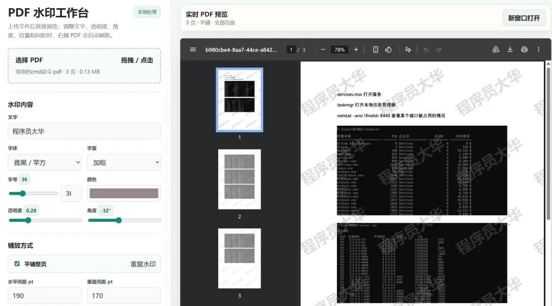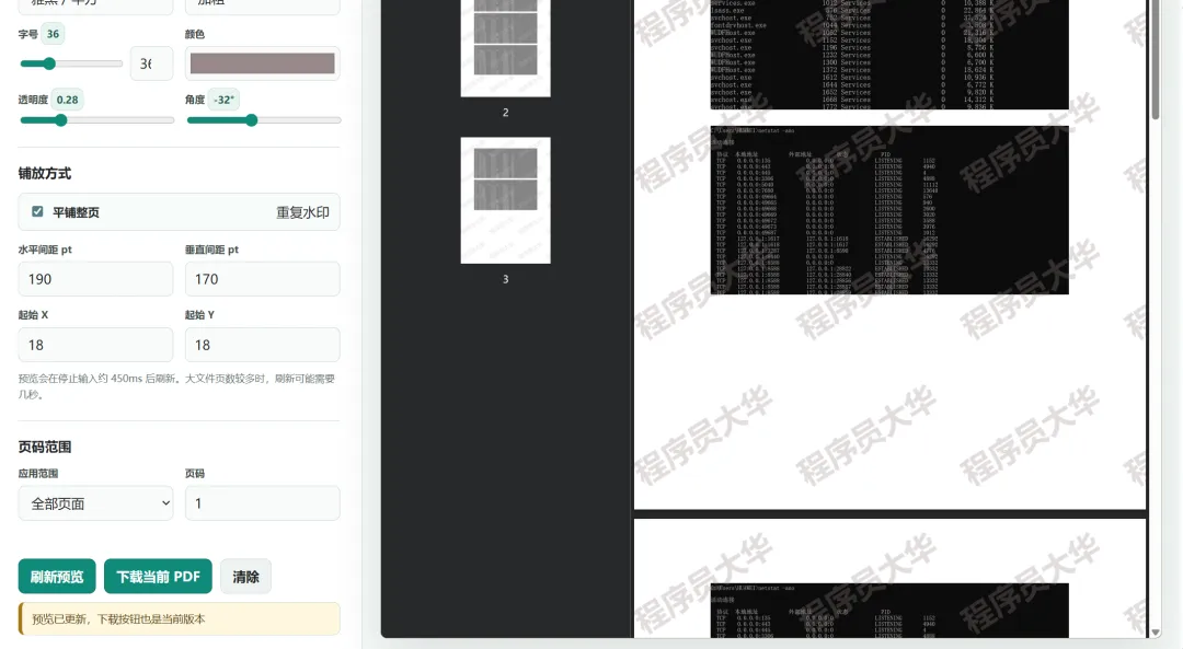 if (currentPdfBlobUrl) { URL.revokeObjectURL(currentPdfBlobUrl);}这个PDF水印工作台的完整HTML文件,我已经放在了公众号后台。关注后回复「PDF水印」就可以获取全部完整代码了。