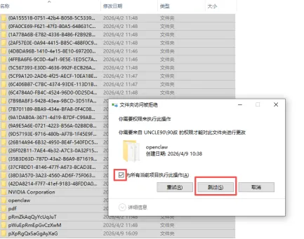 如有提示文件夹访问被拒绝,请勾选“为所有当前项目执行此操作”并点击“跳过”。删除不了是在用的文件,不用理会。