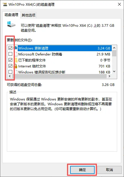 可全选清理的文件项:临时文件、回收站、日志文件、缩略图、传递优化文件、 Windows 更新清理(重点!能清几 GB~几十 GB)、临时 Windows 安装文件。