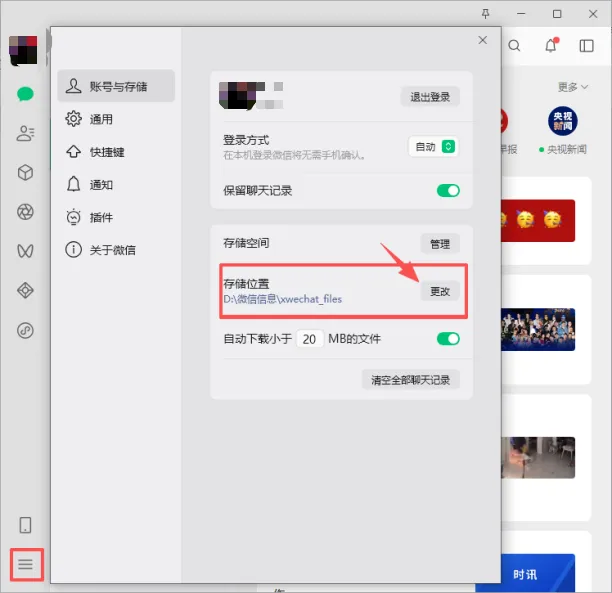 打开电脑版“微信”软件,在“微信”界面左下角处“三”,选择“设置”→存储位置,点“更改”,选择C盘以外的盘新建个文件夹命名后选择并确定,等待数据迁移完成后重新“微信”即可。