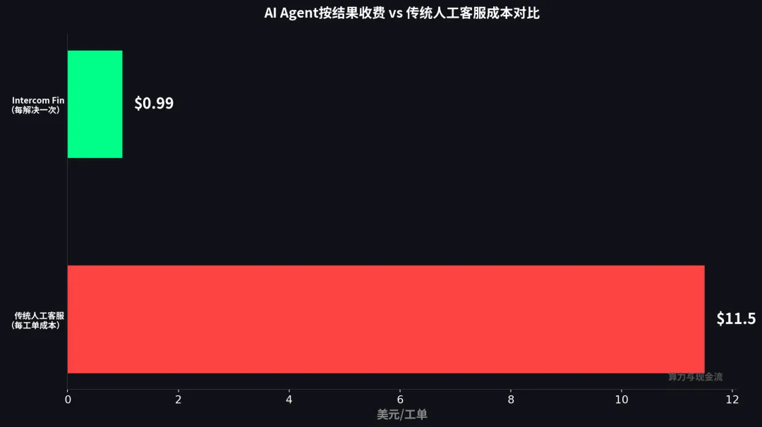 2026年,Intercom的Fin AI客服agent做到了九位数ARR。它的定价方式不是按席位、不是按月订阅——而是每解决一张客户工单收$0.99。解决不了?一分不收。